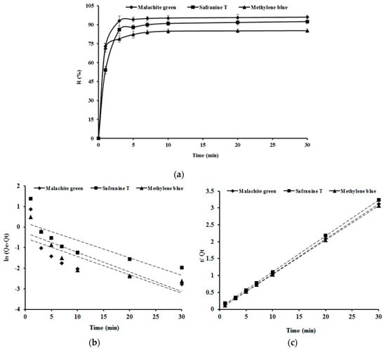 Adsorption removal efficiency of malachite green, safranine T and methylene blue by SSPE 1 g of SSFE with different times at 100 mg/L of initial dye concentration, pH 6.0 and 303 K of temperature. (a), Plots of first-order kinetics (b) and second-order kinetics (c). The solid lines are the experimental data, and the dashed lines are the linearized first-order and second-order kinetics fitted models.