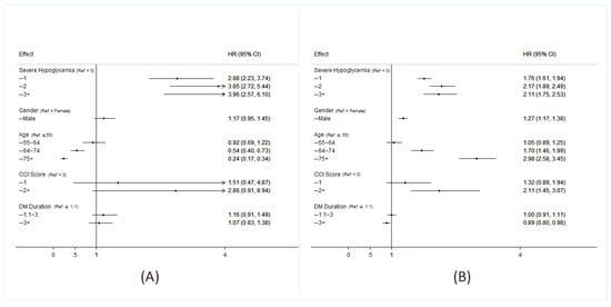 Hazard ratio for all-cause mortality (A) and of incidence of ESRD (B) in patients with type 2 diabetes among each group. (A crude model was calculated by entering one variable at a time. Cox regression of each factor adjusted by hypoglycemia, age, gender, Charlson comorbidity index (CCI), DM duration. HR = hazard ratio).