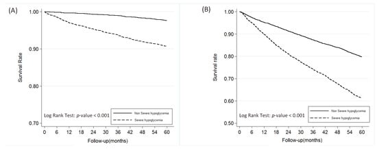 The current nationwide cohort study found a strong association between SH and mortality and CKD. Similarly, the ACCORD and ADVANCE trials, reporting results of their post-hoc analyses, indicated a strong correlation between hypoglycemia and mortality [,,,,]. A retrospective cohort study by Zhao et al. [] reported higher incidence rates of microvascular complications in veterans with type 2 diabetes than those without type 2 diabetes. Our study found type 2 diabetes patients who had had SH events progressed more rapidly into ESRD than diabetic patients who had not had SH events.