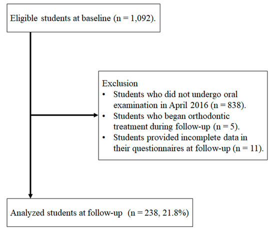 We obtained data from first-year students who had undergone both a general health and oral examination at the Health Service Center of Okayama University in April 2013 (baseline). The inclusion criteria at baseline were Japanese students 18 or 19 years of age who did not show malocclusion, did not have experience receiving orthodontic treatment, and provided complete data in their questionnaires. Before graduation, students volunteered to receive both the general health and oral examination in April 2016 (follow-up). We excluded students who did not undergo the oral examination at follow-up, began orthodontic treatment during a residence, or provided incomplete data in their questionnaires at follow-up.
