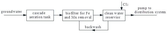 Shenyang is the capital of Liaoning Province in Northeast China. Groundwater is an important water supply source in Shenyang. The groundwater temperature is 10–12 °C all year round due to the latitude. In this paper, the groundwater came from 16 deep wells (depth 60–100 m). The water outputs were between 100 to 150 m3/h; the groundwater characteristics are shown in Table 1. The total treatment capacity of the WTP (Water Treatment Plant) is 3 × 104 m3/d; the flow chart is shown in Figure 1, with the aim that the simultaneous removal of iron and manganese occurs in one filter. After the raw water was extracted from the ground, it first entered the cascade aeration tank for oxygen filling, which provided sufficient oxygen for the subsequent bio-oxidation of iron and manganese in the biochemical filter, where iron and manganese ions were oxidized into solid iron and manganese oxides, which were intercepted and removed by the filter layer. Finally, the purified water entered into the clear water reservoir and then the distribution pipe network. With the extension of filtration time, the interception impurities of the filter layer increased, and the filtration resistance increased sharply, and the filter backwashing process was needed. The filter had a depth of 1000 mm, using sand as the filter media, with a diameter of 0.5–1.2 mm.