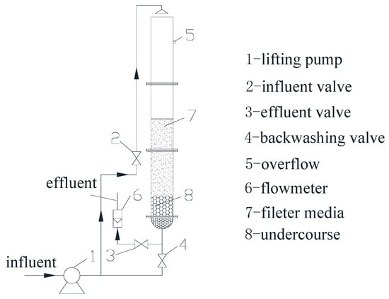 The test device is shown in Figure 2. The filter column was made of Plexiglas with a height of 3 m and an inner diameter of 250 mm. A sampling port was set every 10 cm along the direction of the filter layer. In order to simulate the actual productive filter, the filling of filter media and the inoculation amount were consistent with those in filter 1#. The filter column adopted a downward flow, and the filter speed was controlled by a flowmeter to ensure uniform filtration. The backwashing strength was controlled by the expansion rate of filter media, using about 15–20%. The influent and backwash water were both from the aeration tank.
