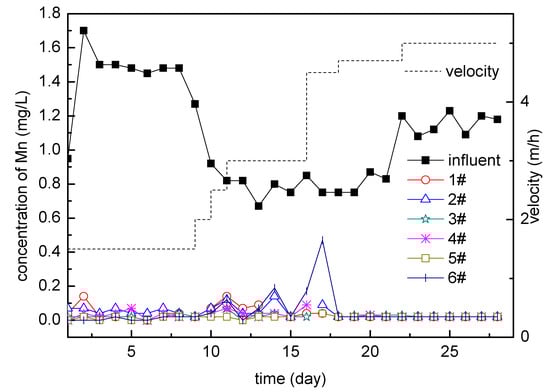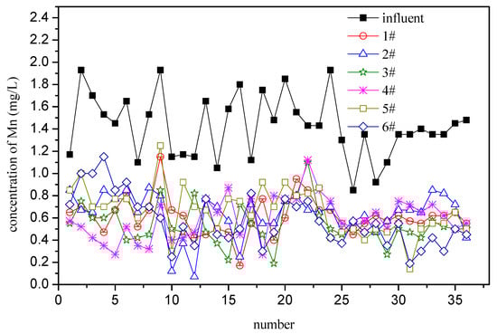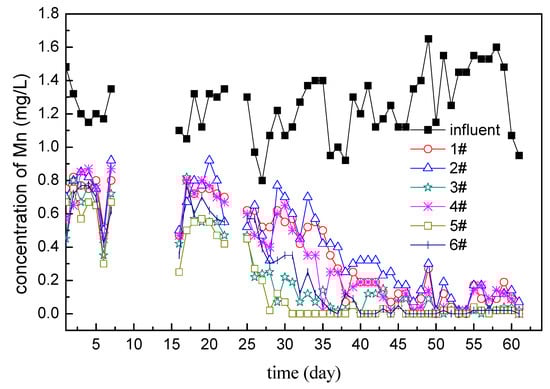 According to the figure, the continuous operation process could be divided into two stages. The first month was a period of rapid decline of the manganese concentration in the effluent, and the second month was a period of fluctuation of the effluent in a low manganese concentration. Although the inoculation amount of filter 3# was twice as much as that of the other five filters, and the removal efficiency of filter 3# was better than that of filters 1#, 2#, 4# in the first month. However, filter 6# has almost the same effect as filter 3#, and filter 5# did even slightly better; these differences might stem from the fact that it is impossible for the filter and the operation to be completely the same. Finally in the second month, the six filters all entered the same fluctuation stage with a low concentration of manganese, i.e., basically no difference.