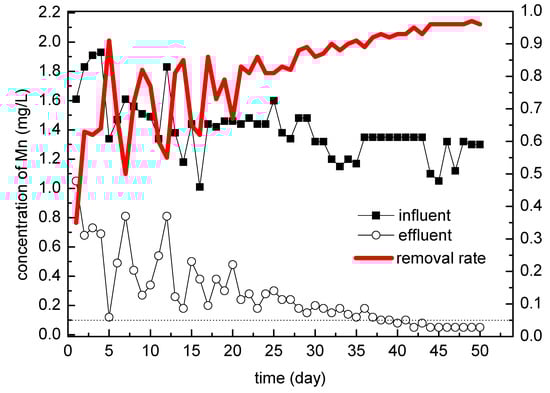 The concentration of manganese in the effluent in Figure 6 fluctuated around 0.6 mg/L after the operation of the filter column, which is similar to the actual production filter, but the concentration of manganese in the effluent decreased gradually, and was finally below 0.1 mg/L within 40 days; the removal rate was as high as 95%, and all these phenomena indicate that the biological filter layer was mature. It can be found that the manganese variation curve of the effluent from the filter column was similar to that of the effluent from the production filter after continuous operation. Therefore, in the first four months of intermittent operation of the water plant, the cultivation of the biological filter almost had no effect. The reason could be that the intermittent operation could not provide a good environment for the microorganisms in the filter layer, so the microorganisms have been staying in the adaptive stage and have not entered the logarithmic growth stage [23].