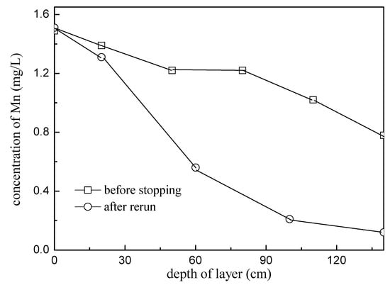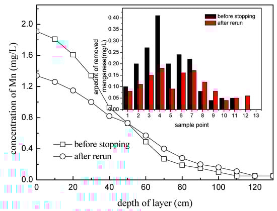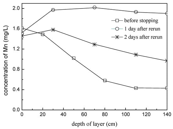 Mn concentration at the different height layers of the filter column before stopping and after rerun.