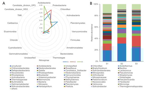 - Fierer, N.; Leff, J.W.; Adams, B.J.; Nielsen, U.N.; Bates, S.T.; Lauber, C.L.; Owens, S.; Gilbert, J.A.; Wall, D.H.; Caporaso, J.G. Cross-biome metagenomic analyses of soil microbial communities and their functional attributes. Proc. Natl. Acad. Sci. USA 2012, 109, 21390–21395. [Google Scholar] [CrossRef] [PubMed]
