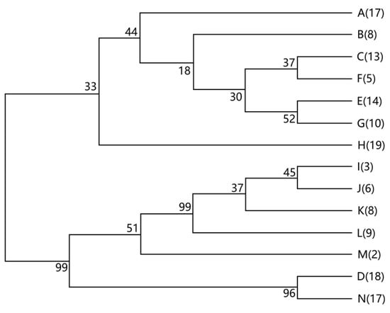 - Saitou, N.; Nei, M. The neighbor-joining method: a new method for reconstruction of phylogenetic trees. J. Mol. Biol. Evol. 1987, 4, 406–425. [Google Scholar]