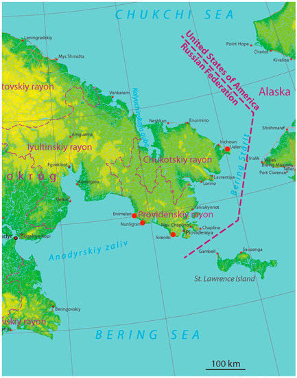 - Ainana, L.; Mymrin, N.; Zelensky, M.; Bychkov, V.; Zagrebin, I. Preservation and Development of the Subsistence Lifestyle and Traditional Use of Natural Resources by Native People (Eskimo and Chukchi) in Selected Coastal Communities (Inchoun, Uelen, Lorino, Lavrentiya, Novoye Chaplino, Sireniki, Nunligran, Enmelen) of Chukotka in the Russian Far East During 1998; Anchorage and Barrow, AK: Shared Beringian Heritage Program; U.S. National Park Service and Department of Wildlife Management: North Slope Borough, AK, USA, 2000. [Google Scholar]