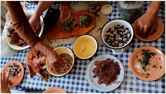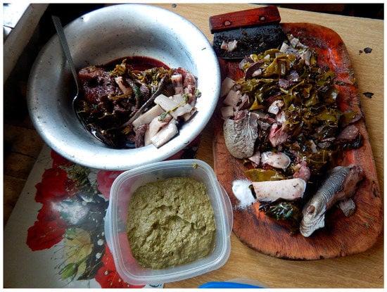 The overall extent to which individuals and families mix store-bought and local foods in their diet varies to a high degree and is determined by a complex array of intersecting factors, including age, occupation, monetary income, time of year, access, experience with state institutions such as boarding school, family relationships, personal preferences, and culturally held ideas about food, health, and status in society. Attitudes toward certain foods vary among individuals, members of different generations, and people of different occupations []. They are also based on a number of other parameters including the concern for contaminants. Nevertheless, in every community where we have worked, and as has been stated by researchers working in other regions of the Arctic [,,,,], people share a widely held belief that eating locally harvested foods is a core cultural expression, important for nutrition, spirituality, social ties, quality of life, and survival in a physical sense and as a people. It is not only eating, but the entire way of life within which local foods and cuisines are embedded—being out on the tundra and at sea, advancing and passing on the knowledge of environmental conditions and the skills of hunting and foraging, and the associated labor and cooperation necessary to maintain tools and equipment and to procure and process foods, as well as all the inextricable social relationships—is considered healthful and essential. Most importantly, the spiritual grounding of the indigenous foodways is part of the indigenous cosmology, where humans and animals are tied by the circulation of souls and kinship bonds, and the souls of the late relatives live in the animals who, when they are hunted, return to their families to care and provide for them [].