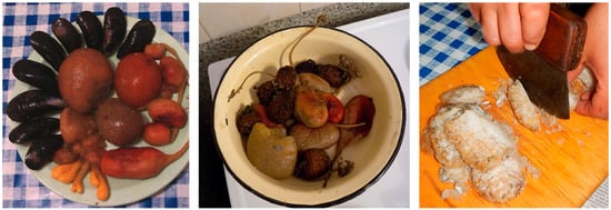 Everyday meals in most instances are consumed with members of the family and guests gathering around a communal platter, which can be a carved wooden dish, a cutting board, enamel or aluminum bowl, or a standard manufactured serving tray. Most or all of the meal’s ingredients are laid out on a platter (or multiple bowls and platters, in the case of a larger feast), cut into bite-size pieces, with the expectation for every eater to reach and grab, at their own pace, using their fingers (Figure 2, Figure 3 and Figure 4). A single meal may feature several types of marine mammals (prepared by different means: aged, aged and then boiled, boiled after having been harvested and/or frozen, dried), reindeer and other terrestrial mammals and birds (aged and/or boiled or roasted), fish (dried, aged, smoked, frozen-sliced, or boiled), plant products (fresh or frozen greens, roots, combinations of several tundra plants mashed with blubber, blood, and fish raw), and a category of foods colloquially referred to as “gifts of sea” or just “seafood.” The last includes various types of crustaceans, including the mollusks taken from walrus stomach, and tide-carried marine flora and fauna, harvested predominantly along the seashore following a storm. Kelp (which may be procured while boating near the shore or collected on the beach) is appreciated for the flavor it adds to the meat and fish broths; boiled seaweeds are featured on meat platters and eaten in combination with other foods (Figure 3). Most ascidians are eaten freshly collected, shortly following the harvest; they are considered a treat (Figure 5). In the instances where they are frozen for future consumption, the leftovers are eaten frozen-uncooked, as part of a larger meal to which they are said to add the desired saltiness, several kinds of unique textures, and the aroma of sea. The ascidian of special cultural importance is Halocynthia aurantium, known locally as upa (Figure 6). Harvesting upa is an activity in its own rite, which involves long outings on the sea ice, repeatedly lowering a rake attached to a long rope in the hole in the ice in an attempt to scrape a cluster of these bright orange tunicates from the sea bottom. The village of Novoe Chaplino (also part of the Providensky district though not surveyed in the current study) is especially famous for its abundance of upa [] and in 2017 was the site of Upafest—a regional festival dedicated to the associated activities and dishes (an array of salad-like combinations with both local and store-bought ingredients, variably dressed) associated with this product. Residents of Novoe Chaplino provide upa to their relatives and friends in other villages, including the three that are surveyed here. The chart in Figure 7 shows the consumed amounts of foods in each category, reported by the 2016 survey respondents in Enmelen, Nunligran, and Sireniki.