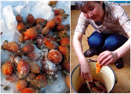 - Yamin-Pasternak, S.; Kliskey, A.; Lilian, A.; Pasternak, I.; Schweitzer, P. The Rotten Renaissance in the Bering Strait: Loving, Loathing, and Washing the Smell of Food with a (Re)Acquired Taste. Curr. Anthropol. 2014, 55, 619–646. [Google Scholar] [CrossRef]
