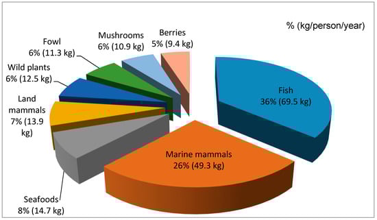 In 2001–2002, community-based dietary and lifestyle surveys and an environmental exposure assessment that focused on local foods were conducted in coastal Chukotka, along with other Russian Arctic regions within the framework of the Russian Arctic persistent toxic substances (PTS) study []. The dietary survey (interviews of 251 indigenous people in the Uelen settlement) was based on self-reported daily (weekly, monthly) food frequencies. Nutritional patterns of the Yupik and Chukchi population residing in Uelen were for the first time presented at the Arctic Monitoring and Assessment Program (AMAP) conference “Impacts of POPs and mercury on Arctic environments and humans” in Tromso in January 2002 []. Subsequently, the main graph depicting the average annual consumption of local traditional foods by coastal Chukotka natives was reproduced in the AMAP Assessment Report 2009: Human Health in the Arctic [] and in the monograph “Implications and Consequences of Anthropogenic Pollution in Polar Environments” []. The comprehensive article devoted to the dietary exposure to persistent organic pollutants and metals of Chukotka native people (based on the 2001–2002 collected data) was published in 2012 []. The Russian Arctic PTS study has revealed coastal Chukotka to have the highest (compared to other Russian Arctic regions) levels of contamination found in local foods and the highest contaminant exposure levels of local indigenous people.