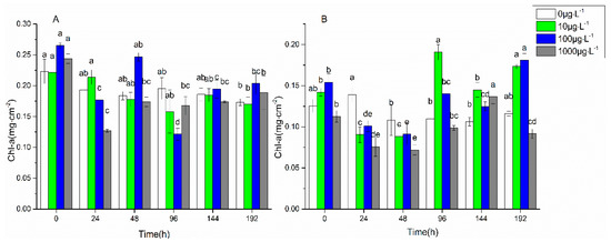 Changes of chlorophyll a content with time under florfenicol (A) and ofloxacin (B) stress. Marking the same letters, such as a and ab, represents no significant difference (p > 0.05), and marking different letters, such as a and b, represents a significant difference (p < 0.05).