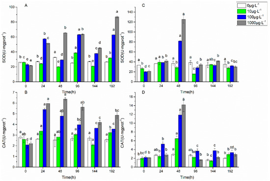 Changes of superoxide dismutase activity with time under florfenicol (A) and ofloxacin (C) stress; Changes of catalase activity with time under florfenicol (B) and ofloxacin (D) stress. Marking the same letters, such as a and ab, represents no significant difference (p > 0.05), and marking different letters, such as a and b, represents a significant difference (p < 0.05).