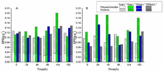 The content changes of extracellular polymeric substances with time under the stress of florfenicol (A) and ofloxacin (B).