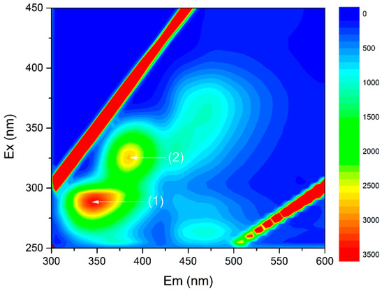 Three-dimensional excitation-emission matrix (3D-EEM) fluorescence spectra of extracellular polymeric substances. Protein-like matters (1) and humic-like matters (2).