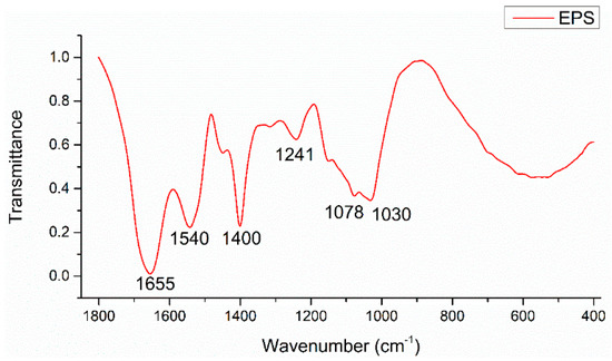 Figure 5 shows the IR spectra of EPS. The band assignments for the IR spectral features of EPS are shown in Table 3. The peaks at 1078 cm−1 and 1030 cm−1 were assigned to the C–O–C ring vibrations and C–OH stretches derived from polysaccharides. The peak at 1400 cm−1 was assigned to the symmetric stretching vibration of carboxyl groups. Moreover, the peaks at 1655 cm−1, 1540 cm−1, and 1241 cm−1 were assigned to the amide І, II, and III vibrations, respectively, stemming from the protein components. The detected C=O functional groups in proteins could combine with antibiotics as reported by Wang, which could prevent the antibiotic invading into biofilm cells [45]. The results showed that proteins in EPS could play an important role in the protection of biofilm cells under the stress of FF and OFL.