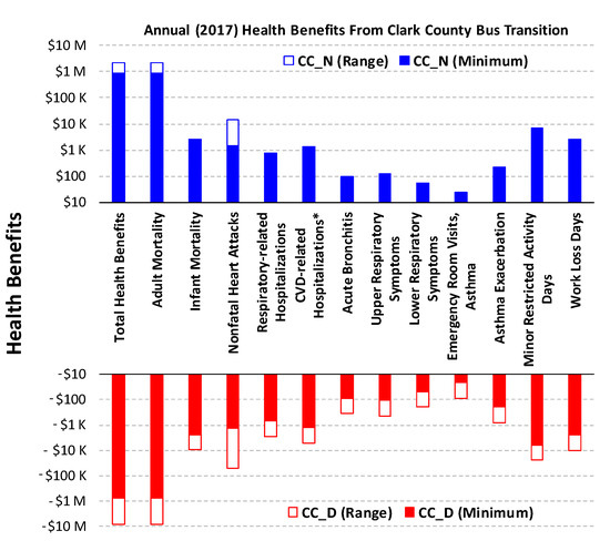 The RTC of Southern Nevada started to switch their public transit buses from diesel- to CNG-powered vehicles in 1999, and as at 2017, more than 75% of its bus fleet were already powered by CNG. For the first time, the health benefits of this venture via reducing PM2.5 exposure level is assessed with the COBRA model. The benefits, including avoided mortality, respiratory- and cardiovascular-related illnesses and hospitalizations, minor restricted activity days, and work days lost, were valuated at $0.79–8.21 million per year for 2017 alone, with ~30% and 70% distributed in- and out-side Clark County, respectively. The wide range of estimates partly reflects uncertainties in diesel bus EFs in case (business-as-usual) RTC has been acquiring new diesel buses instead of CNG buses. Additional benefits of $0.884–2.24 million per year would have been gained if RTC had completed the transition before 2017.