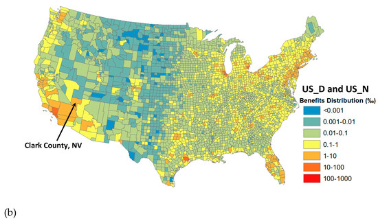 Distribution of health benefits (in ‰) from reducing transit bus emissions (a) in Clark County, Nevada and (b) all over the US, based on the COBRA modeling for (a) CC_D and CC_N and (b) US_D and US_N scenarios. All CC (or US) scenarios yield consistent spatial distributions (see Supplementary Materials Tables S8 and S9 for data).