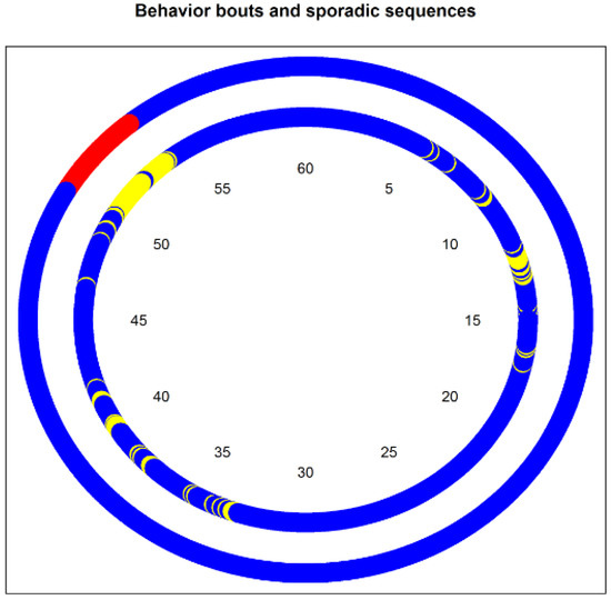 A random sedentary-behavior chart over an hour (based on the empirical distribution of sequence duration). In the inner circle, non-sedentary time is colored in yellow and sedentary time in blue. The outer circle represents, for the same data, the time that is regarded as non-sedentary bout is in red, and as sedentary bouts in blue. This study takes into account both bouts and sporadic sequences, although the latter is disregarded by traditional methodology. Here, 7.6 min were spent in NSB (yellow), and 3.4 in a NSB bout (red). The ratio time in bouts to total time is of 0.42.
