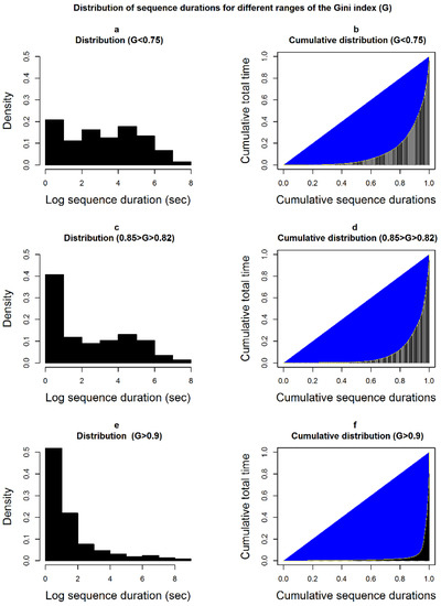 Figure 2. Random non-sedentary sequence durations (sub-figures (a,c,e)) and their corresponding Lorenz curves, i.e., the total time accumulation by sequence duration (sub-figures (b,d,f)), for three different ranges of the Gini index: low (G < 0.75; sub-figures (a,b)), medium (0.85 > G > 0.82; sub-figures (c,d)) and high (G > 0.9; sub figures (e,f)). The durations are randomly drawn from the empirical distributions observed in our population and they add up to the same total time. The Gini index increases as contributions of sequences to the total time are less even (top to bottom). It represents the area between the diagonal and the Lorenz curve (right-hand column) divided by the whole area under the diagonal.