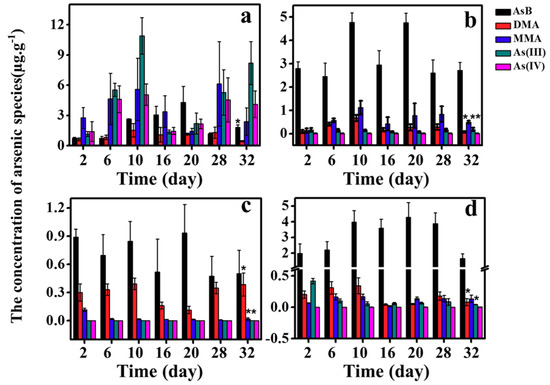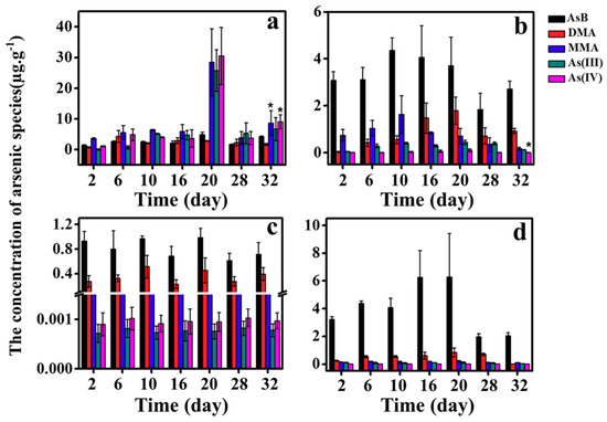 The concentrations of five As species (AsB, DMA, MMA, AS(III) and As(IV)) in: (a) intestine; (b) liver; (c) muscle; and (d) gill during 32 days of As(V) exposure. Analysis of variance was used to test differences of arsenic species during experiment period and significance was marked on 32nd day (p < 0.05).