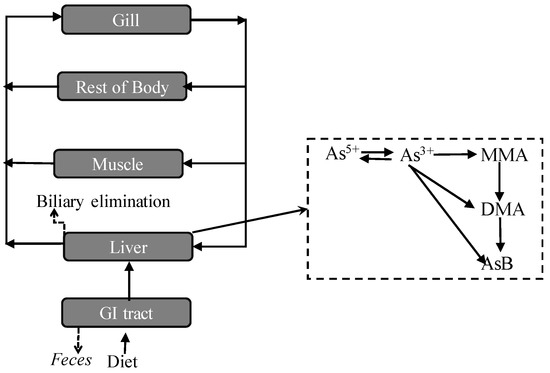 The absorption, distribution, metabolism, and excretion of inorganic arsenic exposure is important to human health risk assessment [25]. In this study, the behavior of inorganic exposure in Tilapia can be described by Figure 5. Based on experimental data (using the accumulation of total arsenic in GI), the absorption rate of As(V) is approximately 120% higher than that of As(III). The inorganic arsenic is firstly oxidized, reduced, and methylated in GI, while the ratio of methylation is lower than that in liver. As acknowledged, As(III) can be oxidized to As(V) and As(V) can be reduced to As(III), and the conversion between As(III) and As(V) also occurred in the GI tract of Tilapia. Similar results showed that As(V) reduction and As(III) oxidization exist in algae [26]. As(V) reduction and methylation are usually considered a detoxification path. In GI, inorganic arsenic can also be transformed into MMA, and excrement that contains large amounts of inorganic arsenic (about 80%) and MMA (about 20%) are out of the body. Thus, only a small fraction arsenic was absorbed by GI tract and further methylated to produce DMA and AsB, which are not easily excluded from the body. Arsenic reached the liver with the blood circulation, which is the main site to methylate, and the proportion of DMA and AsB are increased. Compared to the ratio between MMA and DMA, DMA is a more stable form in Tilapia.