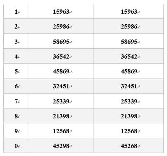 23]: Ten lines of numerals appeared on the computer screen. And each line contained two 5 digits numerals. The subjects were asked to find the only line with different numerals and press the button as soon as possible. The response time (the time interval from the appearance of the numerals to the action of the subject) and the accuracy rate were automatically recorded by the program file. The random numerals of the NIT are shown in