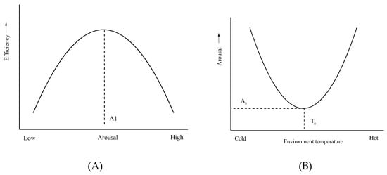 32]. It indicates that there is an inverted U relationship between arousal and work efficiency. The highest efficiency of work occurs at a moderate level of arousal. At a lower level or a higher level of arousal, the work efficiency drops to a lower level. For environmental stress, cold and heat both cause arousal. A moderate temperature has minimal sensory input to the nervous system, and some studies also indicate that warmth can also reduce arousal, that is, a little warmth often results in a feeling of laziness or weakness.