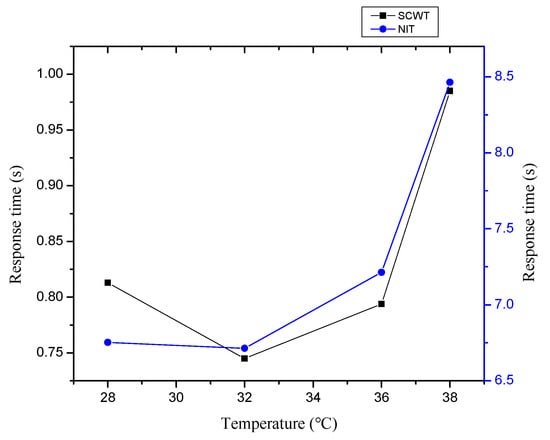 (4) The median of response time in NIT increased with the increase in temperature, and the relationships between them also showed a change trend of a U-shaped curve. More over the median at 38 °C was significantly larger than those at 28 °C, 32 °C, and 36 °C. The maximum response time in NIT appeared between 21:00 and 03:00.