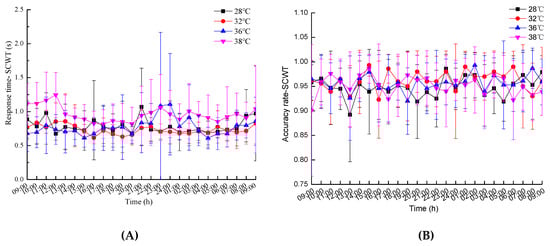 (3) The median of the response time in SCWT increased with the increase of temperature, and the relationships between them showed a change trend of a U-shaped curve. In addition, the median at 38 °C was significantly larger than those at 28 °C, 32 °C, and 36 °C. The maximum response time in SCWT occurred between 21:00 and 01:00.