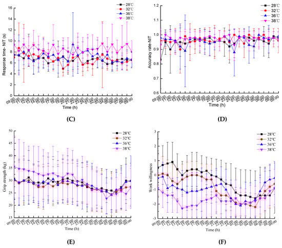 23]. The experiment started at 9:00. The SCWT, the NIT, and the work willingness questionnaire survey were conducted every hour for 24 consecutive hours. The grip strength, thermal comfort, thermal sensation, and physiological parameters (eardrum temperature, rectal temperature, forehead temperature, heart rate, systolic pressure, and diastolic pressure) were also measured every hour for 24 consecutive hours. Meanwhile, the hourly outdoor temperature was accessed from the website of China Weather [