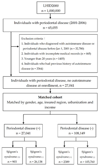 Xerostomia is common in both diseases and immune alterations are evident in SS and PD. An association between SS and PD may exist. Several studies have investigated the risk of PD in patients with SS and they found that the mean plaque index, gingival index, bleeding on probing and mean gingival index were larger in patients with SS [24,25,26]. However, the evidence was not conclusive and the underlying pathophysiology was not clear [27,28]. The increased risk may be bidirectional and the risk of SS in patients with PD remains unclear. Therefore, we conducted this nationwide, retrospective cohort study to compare the risk of SS in patients with PD and a non-PD control group.