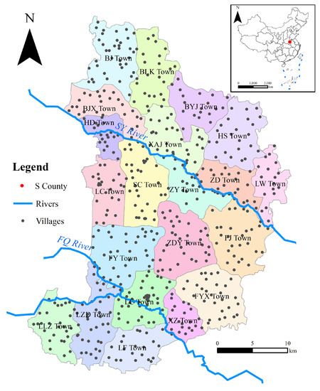 S County (‘S’ derives from the initial of the county name, we have to conceal the full name of some geographical vocabularies related to S County for some reasons), located in Central China, is a ‘famous’ region with both serious environmental pollution and high GCM [7,28]. S County includes 21 towns with a total area of 1080 km2 (Figure 1). S County is generally flat (altitude 35–50 m), and it is gently inclined and slightly descends from northwest to southeast. The region is dominated by warm temperatures and a continental monsoon climate with an annual average temperature of 14.5 °C and an annual rainfall of about 700 mm/m². There are two rivers, the SY and FQ rivers, flowing through this county from northwest to southeast.