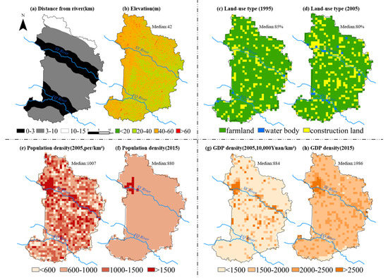 Five environment proxy variables of S County, including (a) distance from the river; (b) elevation (30 × 30 m2); (c)–(d) land-use type (1 × 1 km2); (e)–(f) resident population density (1 × 1 km2); (g)–(h) GDP density (1 × 1 km2). ’Median’ in (b)–(h) is the corresponding median value of proxy variables on grid scale.