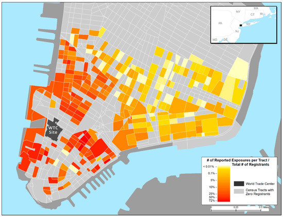 - Farfel, M.; DiGrande, L.; Brackbill, R.; Prann, A.; Cone, J.; Friedman, S.; Walker, D.J.; Pezeshki, G.; Thomas, P.; Galea, S.; et al. An overview of 9/11 experiences and respiratory and mental health conditions among World Trade Center Health Registry enrollees. J. Urban Health 2008, 85, 880–909. [Google Scholar] [CrossRef] [PubMed]