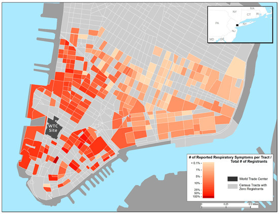 Upper respiratory symptoms were the most common health outcomes reported by lower Manhattan residents in the WTCHR. This finding is consistent with other WTC studies among residents [10] and rescue and recovery workers [17,18,19]. According to Lin et al., residents living within 1.5 km of the WTC site experienced a 200 percent increase of at least one persistent upper respiratory symptom compared to controls in the Upper West Side of Manhattan [10]. Our study also demonstrates high rates of persistent shortness of breath, wheezing, and chronic cough among lower Manhattan residents. These findings are in line with those of Lin et al., who reported that increased rates of lower respiratory symptoms persisted among lower Manhattan residents two and four years after the 9/11 attacks [9]. Moreover, most residents reporting any persistent respiratory symptoms in our study were located within a 0.5-mile radius of Ground Zero. Lin et al. also described an apparent trend when comparing residents below and not below Canal St.: the former had stronger associations between location and both any new-onset and persistent new-onset respiratory symptoms [9]. Reibman et al. also reported that four times as many lower Manhattan residents presented wheezing compared to a control population. In addition, three times as many residents reported cough and shortness of breath [11].