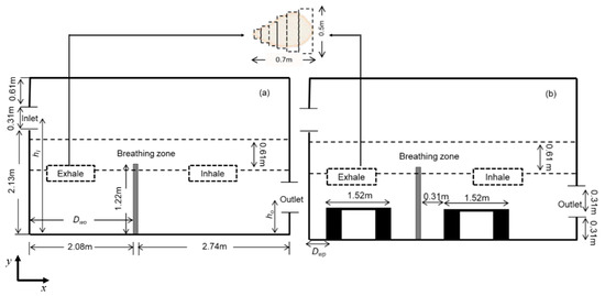 Computational domain: The geometry of the computational domain for a representative case is shown in Figure 1a,b. The source of particles in the space is due to respiratory release represented as a “sneeze”. The dimensions of the 2D space are 4.88 × 3.05 m2, representing an office room shared by two occupants. The partition wall height is 1.22 m and is located 2 m from the inlet side. The inlet and outlet positions and the presence or absence of desks are dependent on the specific case as listed in Table 1. A total of 18 cases are simulated. The parameters varied to change the scenario for the cases are hI and hO, which are the height of the inlet and outlet from the floor of the domain, respectively; Dwp, which is the distance from the wall to the partition in the exhale zone; and Dwo, which is the distance from the wall or the side where the inlet is located to the first obstruction encountered from that wall. The “breathing zone” is in the range of 1 to 2 m from the floor. This zone is further separated into the exhalation and inhalation zones. In the “exhalation zone”, the residing occupant sneezes at a height of 1.07 m from the floor, representing a person sitting at a desk, and the “inhalation zone” is where the second office occupant may inhale the exhaled aerosols. It is assumed that the presence of any aerosol in the breathing zone has the potential of causing infection. The sneeze particles are released in an area measuring 0.7 m in length and 0.5 m in height. The area is divided into six segments where 150,000 aerosols are injected randomly with a velocity range of 6–22 m/s with a particle size of 7 μm, assuming a sneeze volume of 1 L [11,18]. To simulate the high momentum at the point of release and the subsequent loss of energy, it is assumed that the particles released close to the source have the maximum velocity, and, as the distance increases, the particle velocity decreases.