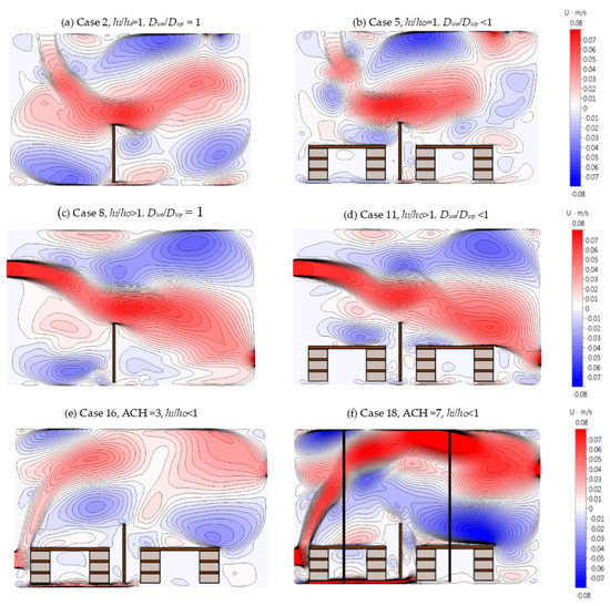 Velocity contour plots at air changes per hour (ACH) = 5 for (a) case 2, (b) case 5, (c) case 8, and (d) case 11; velocity contour plot at ACH = 3 for (e) case 16, and at ACH = 7 for (f) case 18.