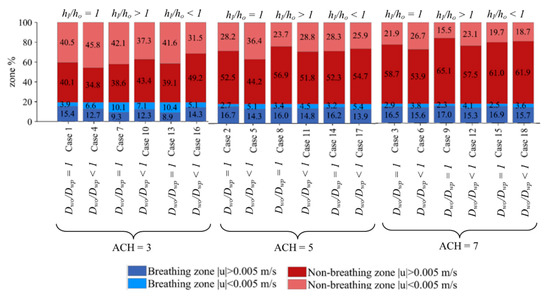 Comparing cases without desks (Dwo/Dwp = 1) and with desks (Dwo/Dwp < 1), the percentage of dead zones in both regions increased when the inlet and outlet were located at the top, for ACH = 3 (cases 1 and 4). When hI/ho > 1 (cases 7 and 10) and hI/ho < 1 (cases 13 and 16), the dead zone percentage decreased with the inclusion of desks for the whole domain. At ACH = 5, dead zone percentage increased for all regions when hI/ho = 1 (cases 2 and 5) and hI/ho > 1 (cases 8 and 11), and it increased for the breathing zone only when hI/ho < 1 (cases 14 and 17). The dead zone percentage decreased for the non-breathing zones for all cases, with cases 14 and 17 as the only exceptions, when desks were included. At ACH = 7, the exception also occurred when hI/ho < 1 (cases 15 and 18) for the non-breathing zone as well, with a slight increase in the percentage of dead zones when desks were included. Overall, it appears that, when the inlet and outlet location satisfies hI/ho < 1, the trend differs from the other configurations. This can be due to the location of the desks in the domain relative to the inlet position.