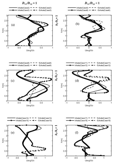 Figure 4 shows line plots of the normalized velocity for cases 2, 3; 5, 6; 8, 9; 11, 12; 14, 15; and 17, 18 at x = 1.1 m and 3.05 m in the exhale and inhale zones (locations shown in Figure 2d using line probes). Figure 4a compares the velocity profiles for cases 2 and 3 where ACH increases from 5 to 7. The air-flow inlet and outlet were located at the top, i.e., hI/ho = 1, and no desks were present, Dwo/Dwp = 1. Increasing the ACH caused a vortex or recirculation zone to form near the domain for ACH = 7; otherwise, the line plots were similar for both locations. Figure 4b shows cases 5 and 6 with desks, which resulted in velocities near zero at desk heights. Figure 4c,d show line plots for cases 8, 9; and 11, 12, with the inlet located above the outlet, hI/ho > 1. Maximum velocity values occurred at the inlet height for the exhale side, with the lines nearly overlaying. For the inhale side, the plots appeared to “smooth” out as inlet effects diminished (hI/ho < 1 for Figure 4e,f). The peaks were reversed for the exhale and inhale zones in Figure 4e. The presence of desks resulted in sharp peaks at the lower end of the domain (Figure 4f). Overall, the position of the inlet/outlet on the flow pattern appeared to have a lesser effect when hI/ho > 1, and desks appeared to have a lesser effect when hI/ho = 1. Figure 4 shows the influence of the different configurations on the air-flow pattern, and it highlights the difficulty in comparing the effects of the multiple configurations.