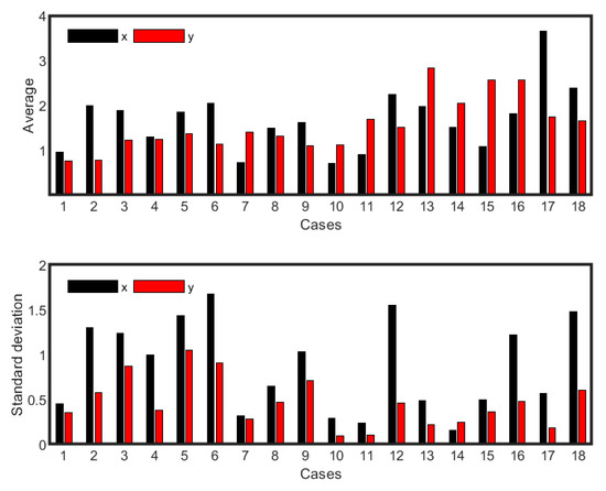 (a) Average (m) of x and y locations for the 18 cases; (b) standard deviation (m) for x and y locations for the 18 cases at the end of simulation.