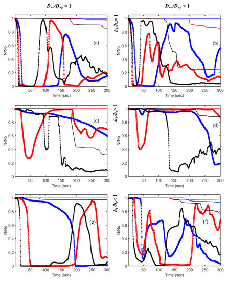The temporal evolution of the particle number in the breathing zone and in the whole domain for all cases is shown in Figure 6. The plots show the unique impact of each configuration of the 18 simulations. The effect of increasing ACH from 3 to 7 is shown in every plot. The first column in the figure is for the cases with the presence of the partition only, Dwo/Dwp = 1, and the second column is for the cases with both partition and desks, Dwo/Dwp < 1. The first row is for hI/ho = 1, the second row is for hI/ho > 1, and the third row is for hI/ho < 1. Lines in the plot represent particle number evolution in the whole domain, and lines with markers represent evolution in the breathing zone only.