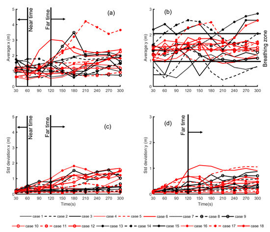 To assess the temporal trend for all cases, the average and standard deviation change over time for the x and y locations of the particles in the whole domain and in the breathing zone were plotted (Figure 7). The dispersion trend of the particles could be classified under “near time”, <60 s after release, and “far time”, >120 s after release, along the horizontal direction of the room (Figure 7a,c). For the first 60 s, the average location of the particles was on the inlet side, around the exhale zone, before dispersing afterward. After that, the effects of the room configuration appeared to take over with the average value of x location, i.e., the spatial distance from the inlet side or the exhale region, increasing. The value of x was mainly higher for higher ACH and for the configuration hI/ho > 1, while it was lower for ACH = 3. Figure 7c is the corresponding temporal change of the standard deviation of the spatial x locations. The standard deviation is a representation of the particle clustering trend. Within the first minute of release, the standard deviation was ~0.5 or less for all cases. After 120 s, the particles started dispersing for some scenarios, and, for others, the particles remained clustered for the entire particle tracking duration.