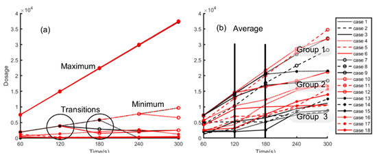 Figure 8a shows the results for the maximum and minimum dosage for the 18 cases, and Figure 8b shows the change in average dosage over 300 s. The maximum inhaled dosage increased exponentially and overlapped for all cases, with the maximum value at 4 × 104. For the minimum value, it varied with the highest being near 1 × 104 for cases in which hI/ho > 1 and desks were present with the exception of when ACH = 7 (case 12). The minimum hovered near zero and decreased for the other configurations of hI/ho. There appeared to be a change in the behavior after 120 s and then after 180 s.