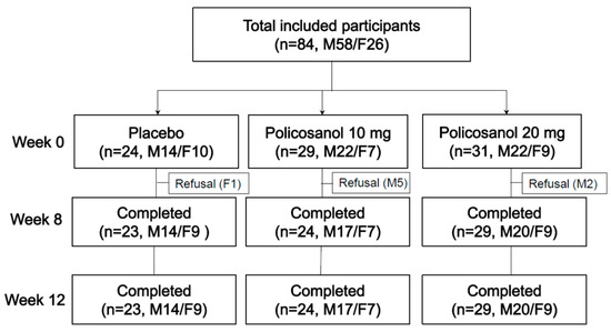 This study was a double-blinded, randomized, and placebo-controlled trial with a 12-week treatment period. Participants were informed to consume one tablet per day containing policosanol (10 mg or 20 mg) or placebo, and film coated tablets were manufactured by CosmaxBio, Inc. (Jecheon, Korea) for this study. The ingredients, manufacturing process, and facility were approved by the Korean FDA. All participants were advised to avoid aggressive changes in dietary habits and excessive alcohol consumption (less than 30 g of ethanol per day). They were also instructed to avoid intense exercise (less than 30 min per day at 60–80% maximum capacity). If subjects had a sedentary lifestyle before the study, they were encouraged to balance their lifestyle during the policosanol consumption period to avoid bias due to exercise or other lifestyle habits.