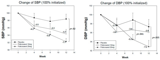Within each policosanol group, multiple comparisons using the LSD method revealed the policosanol 10 mg group to show a significant reduction of SBP at 4 weeks (p = 0.0004), 8 weeks (p = 0.007), and 12 weeks (p = 0.0002) compared to that at 0 week. The policosanol 10 mg group also showed a significant decrease in SBP at 12 weeks (p = 0.025) compared to that at 4 weeks. The policosanol 20 mg group showed a more significant reduction of BP at 4 weeks (p < 0.001), 8 weeks (p < 0.001), and 12 weeks (p < 0.001) compared to that at 0 week. The policosanol 20 mg group also showed a significant reduction of BP at 8 weeks (p = 0.021) and 12 weeks (p < 0.001) compared to that at 4 weeks. In addition, the policosanol 20 mg group showed a significant reduction of SBP at 12 weeks (p = 0.007) compared to that at 8 weeks.