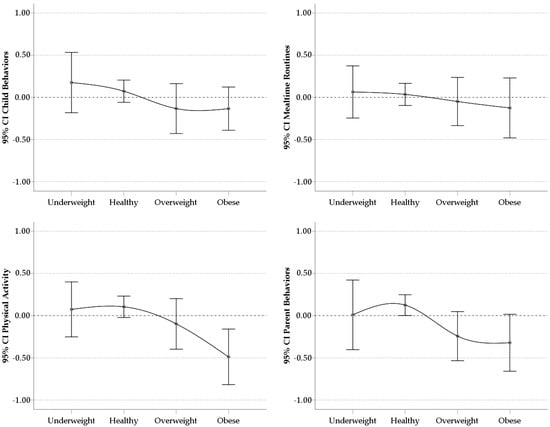 Figure 1 shows a curved descending pattern from the healthy weight group to the obese group in the family health habits. The underweight group scores similar to the healthy weight group. In any case, the distribution of the means of the scores of Child Behaviors and Mealtime Routines was overlapping between the different groups taking into account the 95% confidence intervals around the means showing no discriminative power. However, in the case of the scores of the Physical Activity and Parent Behaviors, the healthy weight group showed an average outside the confidence interval of the obese group.