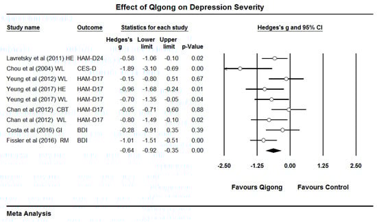The Comprehensive Meta-Analysis Version 2 Software (BioStat, Englewood, NJ, USA) was employed to perform the data synthesis. The synthesized effect size (Hedges’ g), which expresses the magnitude of Qigong effects on the severity of depressive symptoms, was calculated with a 95% confidence interval (CI). The magnitude of Hedges’ g was then classified as being either a small, medium, or large effect (small effect = 0.2, medium effect = 0.5, large effect = 0.8), with a negative value indicating lower depression severity due to the beneficial effects of Qigong in comparison to the control groups. Odds ratios (OR) with 95% CIs were calculated for both response rates and remission rates. Since the measuring instruments across the selected studies were different, a random-effects model was adopted. Study heterogeneity was assessed using the value of I-squared and were divided into three levels (low = 25% or below; medium = 25% to 50%; large = 75% to 100%) [].