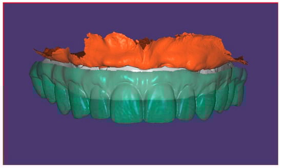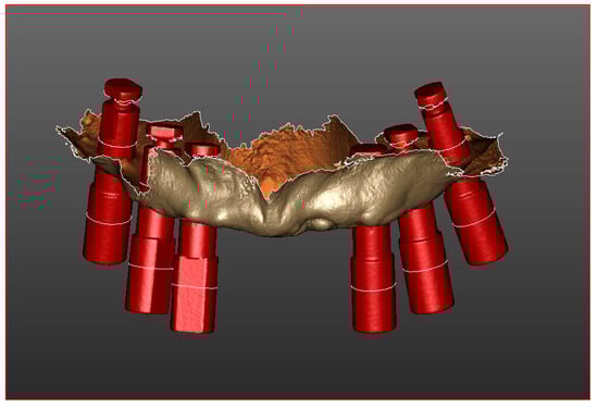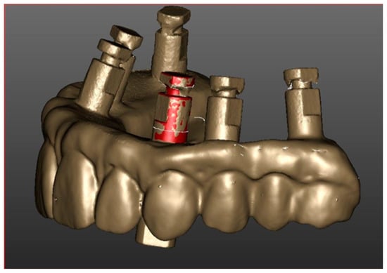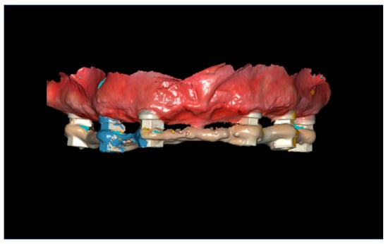 The virtual model of the temporary prosthesis, attached to implant analogs, is then also acquired extraorally through a laboratory scanner (Neway, Open Technologies, Rezzato, Italy) to verify the accuracy of the intraoral scanning [,] (Figure 4). In cases in which a difference between the intra and extraoral scanning was noticed, the restoration would be realized using the extraoral scan as a reference.